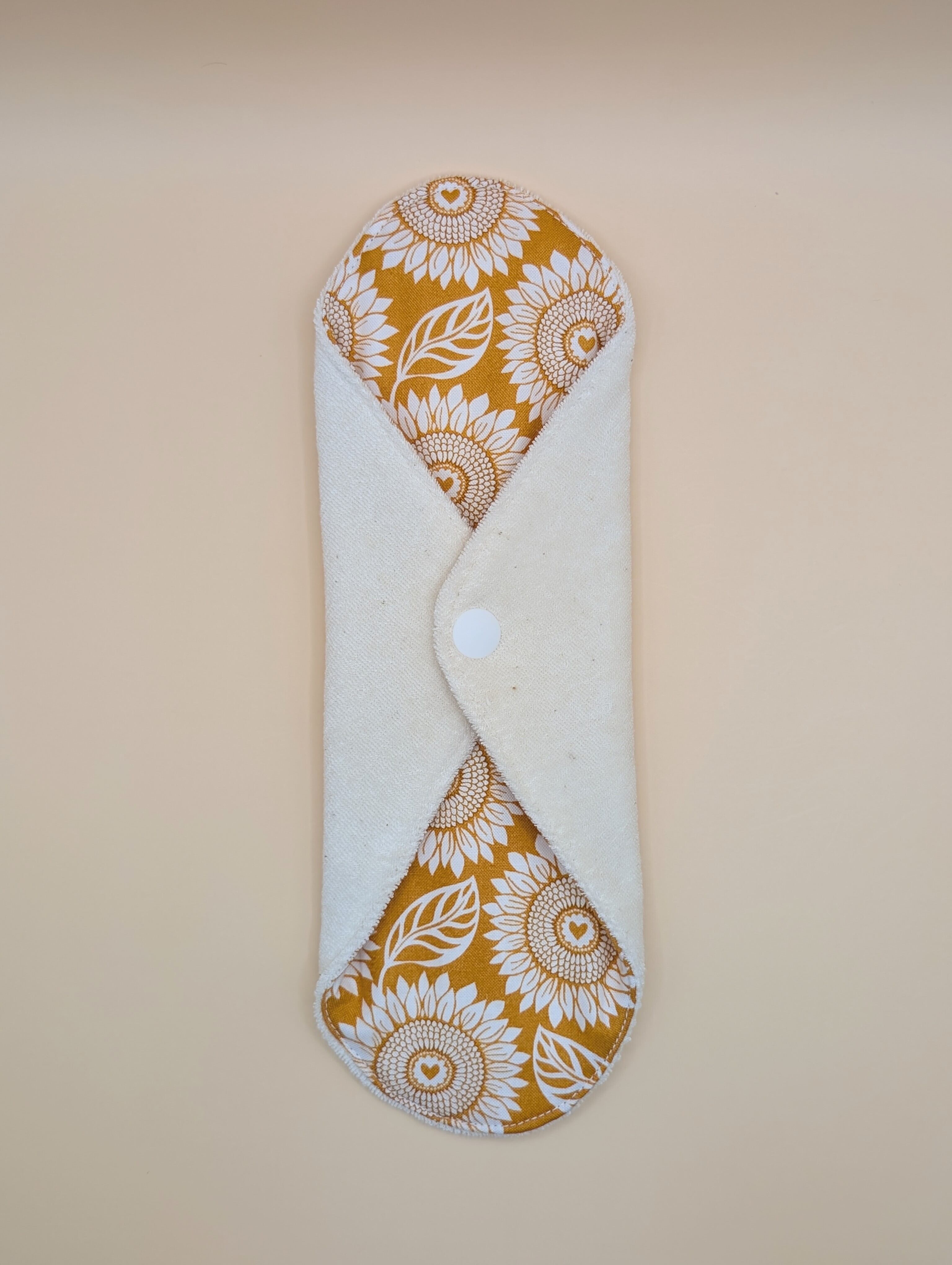 華やかなヒマワリ柄が特徴のこの布ナプキンは、日中の多い日用に最適です。縫い糸までオーガニックコットン100%のこだわり仕様。