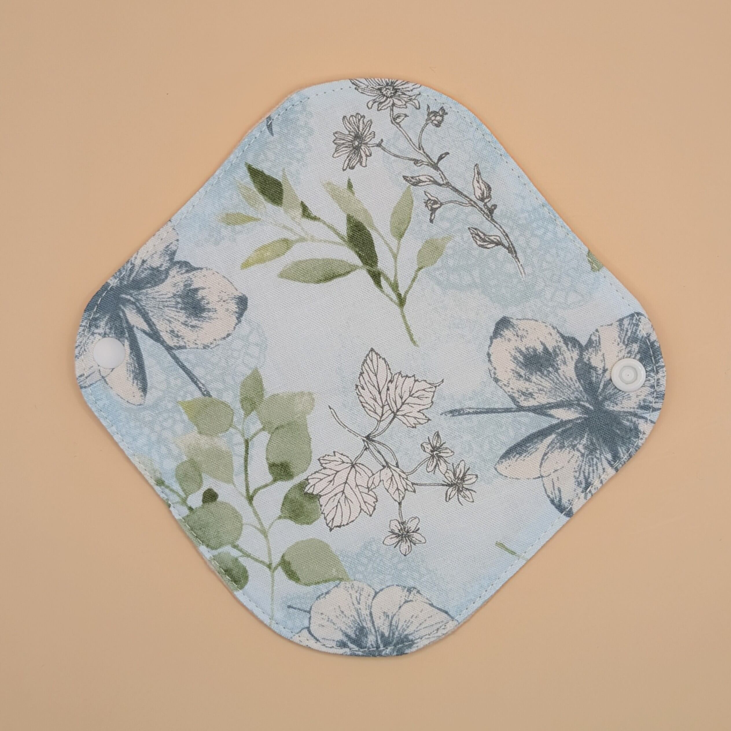 温活に特化したこの布ライナーは、かわいらしい水色の花柄が特徴です。快適で暖かい使用感を実現するために、オーガニックコットン100%で、縫い糸まで天然素材にこだわった布ライナー。