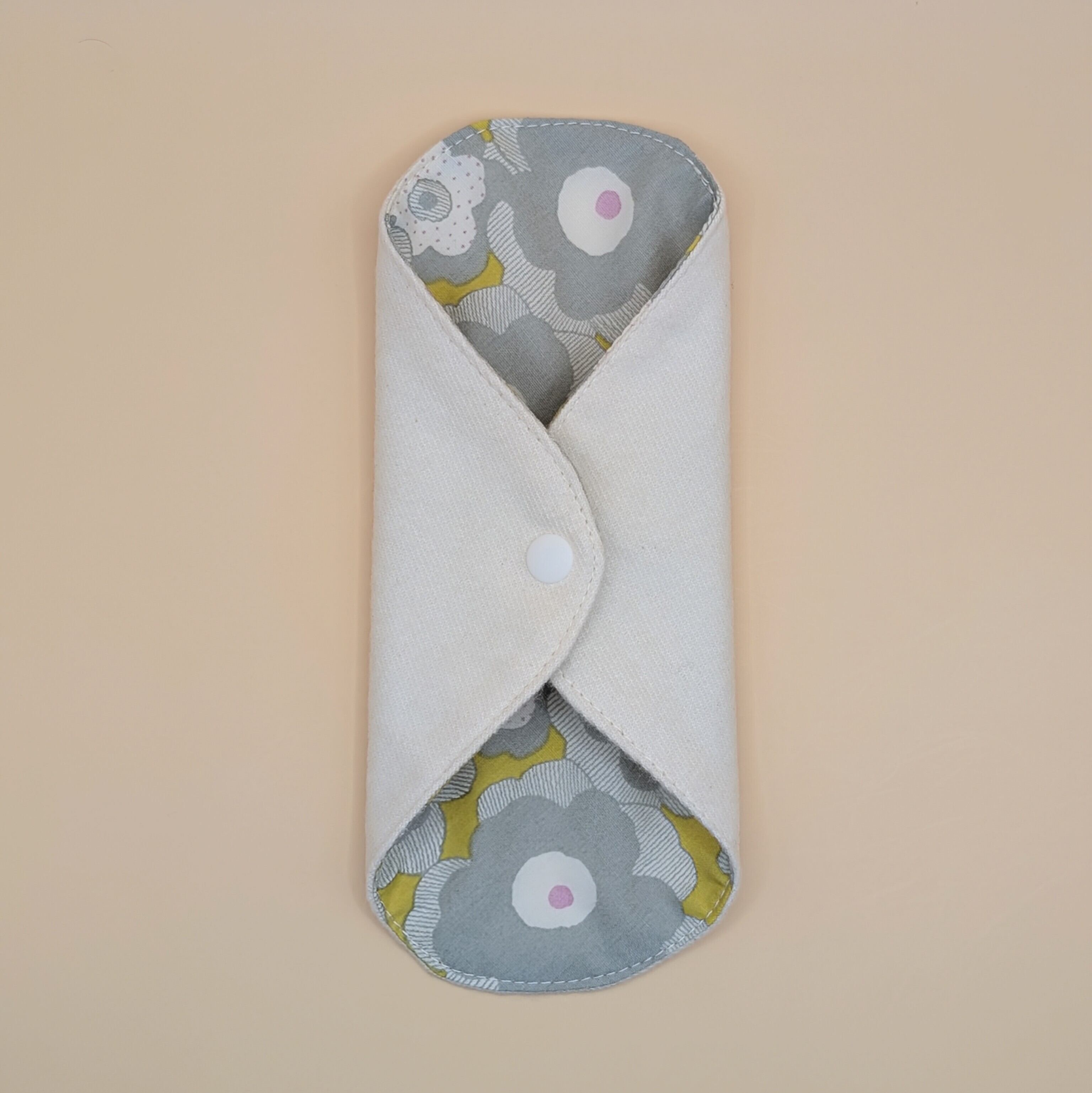 優雅なグレーの大花柄が特徴のこの布ライナーは、機能性とデザインが見事に調和したアイテムです。肌に触れる面も縫い糸まで、すべてオーガニックコットンで仕立てた布ライナー。